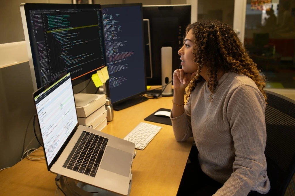 Female developer coding at her desk. She has customized her workspace with a multi-monitor set up and using Visual Studio for Mac.
