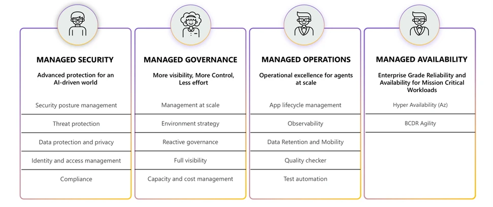 - Zone Three: Enterprise Managed – The most advanced zone, designed for production-grade agents. It includes enhanced security protocols, continuous monitoring, and structured lifecycle management. This zone supports complex, cross-functional and autonomous agent scenarios with full visibility, scalability, and strategic alignment.
