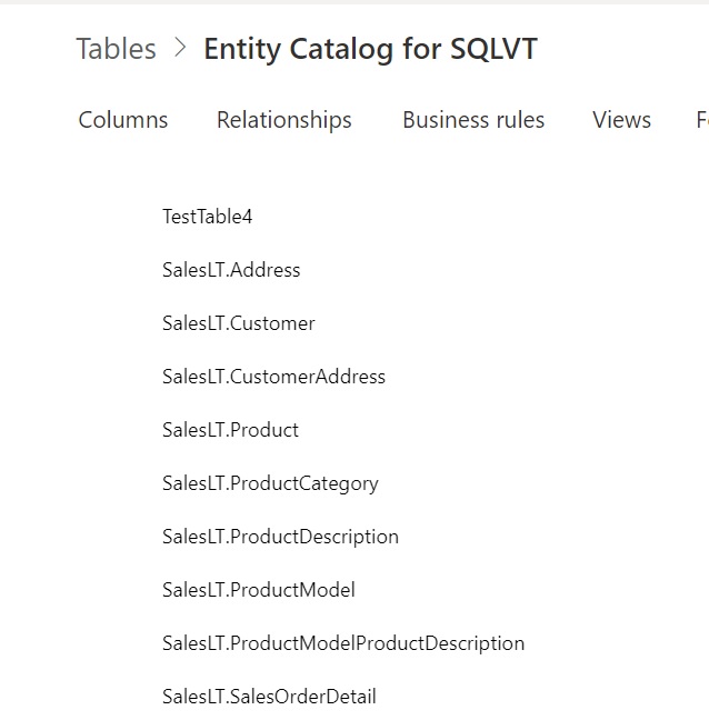 The Entity Catalog will provide you a listing of every table or list from a connected data source that can be used for creating a Virtual Table. This reduces the creation time by eliminating the need to search for the exact table or list names in your source. The catalog is created automatically once you connect to the Virtual Table source.
