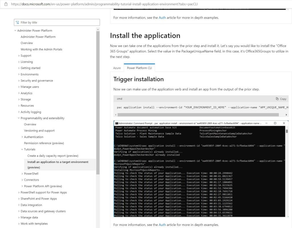 Screenshot of App Install API Tutorial – Using Power Platform CLI