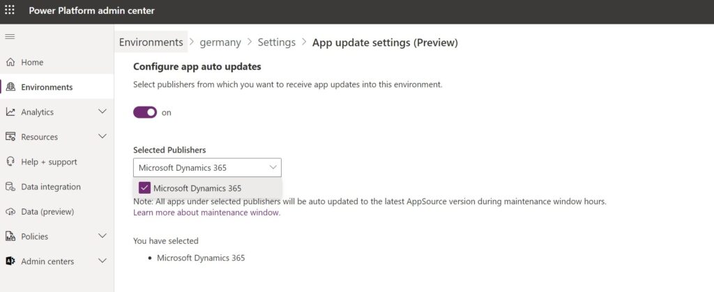 - Pre-approved publishers: Admin users indicate which ISVs are permitted to automatically update apps in their environment once opted in.
