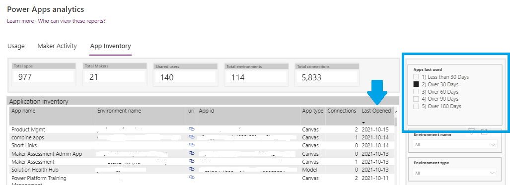 Admins may use the Apps last used filter in the ‘Inventory’ view to identify stale or unused Power Apps based on the Last Opened date. This view includes direct links into the Maker Portal allowing admins to quickly take action.