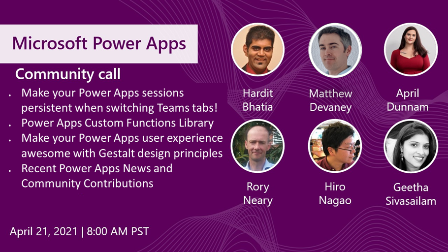 The April Power Apps community call we are happy to announce Hardit Bhatia will be covering his ‘Make your Power Apps sessions persistent when switching Teams tabs!’. Then Matthew Devaney, Geetha Sivasailam, April Dunnam and Hiro Nagao will cover Power Apps custom Functions Library. Rory Neary will deliver the final technical session on Make your Power Apps user experience awesome with Gestalt design principles. The Power Apps community is hosted and lead by MVP and recognized solution architect Todd Baginski.