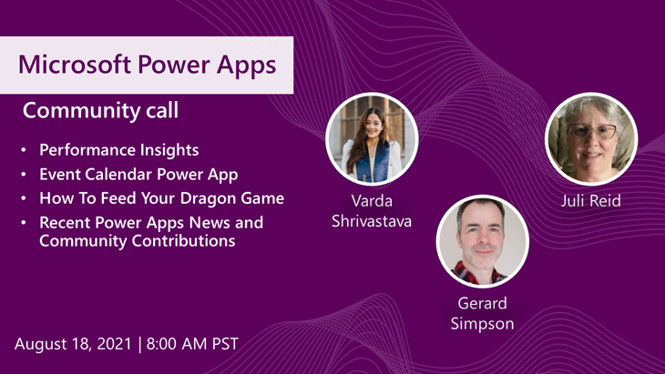 The August Power Apps community calls has a special treat! By popular demand, we are continuing the deep dive walk throughs of the Demo Extravaganza submissions. For August we will be looking at: How to feed your dragon game by Gerard Simpson and Event Calendar App by Juli Reid. Additionally, Microsoft feature PM, Varda Shrivastava will walk us through how to analyze Model-driven applications performance data using Performance Insights. If you haven’t looked at if before, Performance Insights is a self-service tool for enterprise app makers that analyzes runtime user data and provides a prioritized list of recommendations to help improve the performance of Model-driven apps. With this feature, we’re converting raw telemetry data into actionable work items for you to tackle. The call will also include Power Platform Patterns and Practices updates by April Dunham. Of course, none of this would be possible without the host and creator of the Power Apps community call, Power Platform MVP Todd Baginski.