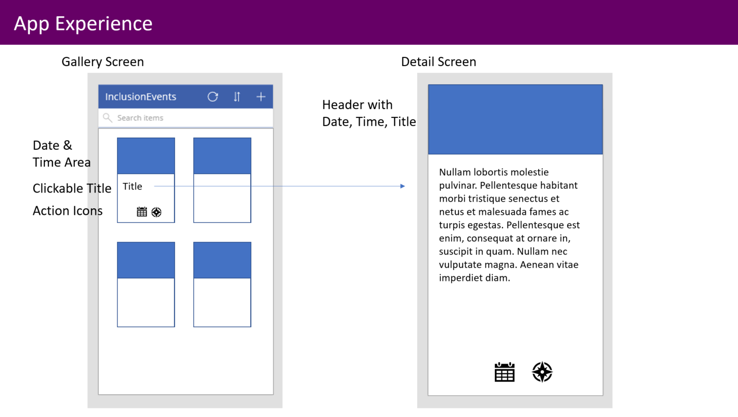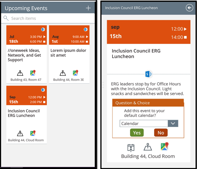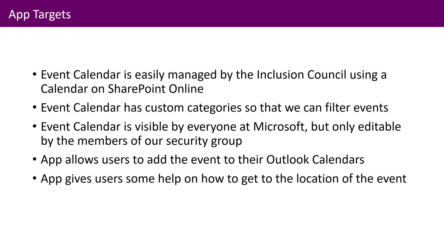 Recently I volunteered to create a calendar app that we could use to share events across our organization, especially in the areas of Diversity and Inclusion. The target goal was to enable us to broadly share relevant events, yet to allow consumers of the app to decide which events they would like added to their calendars. This was a really fun project where I was able to finish most of it on a flight from DC to Seattle. The secret to building this app so quickly was a small amount of planning before getting to the airport. In this blog I’ll share how I approached the planning of the app, and an overview video on how I did it. If you’re not interested in the approach, feel free to jump straight down to the YouTube video (smiles). Including post-draft tweeks from user feedback, the actual app build took only a few hours (because I was so fussy about the custom layout). IMO that is exceptionally fast though, especially when I think of how much harder this experience would be to recreate using traditional form-based tools like InfoPath for instance.