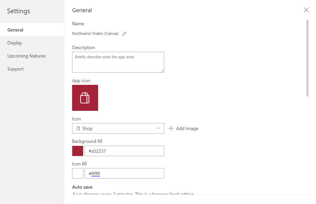 General has the basic app name, description, icon in addition to the permanent generally available settings to configure for your app. You can now rename the app directly inline as well as change the app icon colors by selecting the form the list or by updating the hex code.