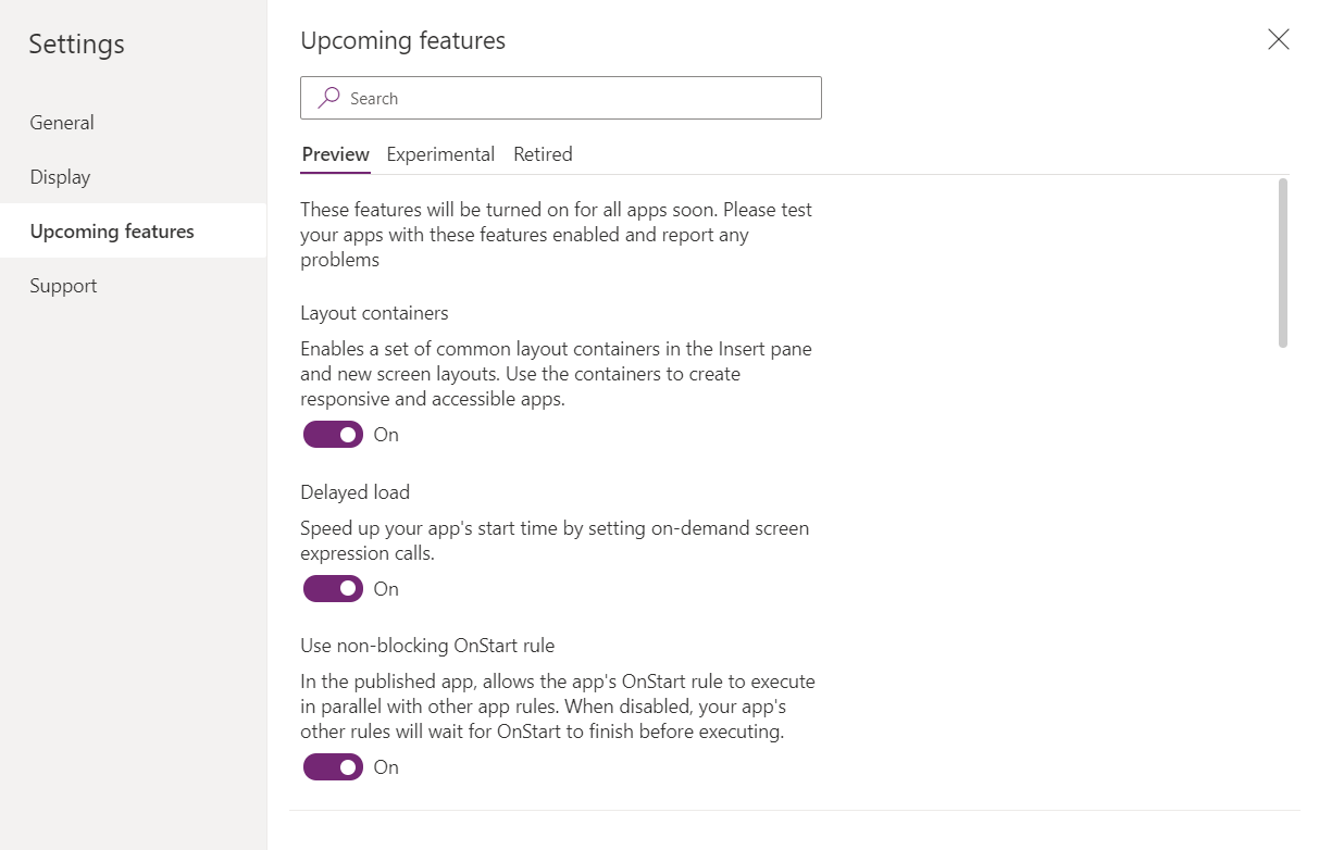 Upcoming features contains all the categorized Preview, Experimental, and Retired settings for features that are being phased in or out. With the search and separate list for each category, this helps streamline finding and understanding these features.