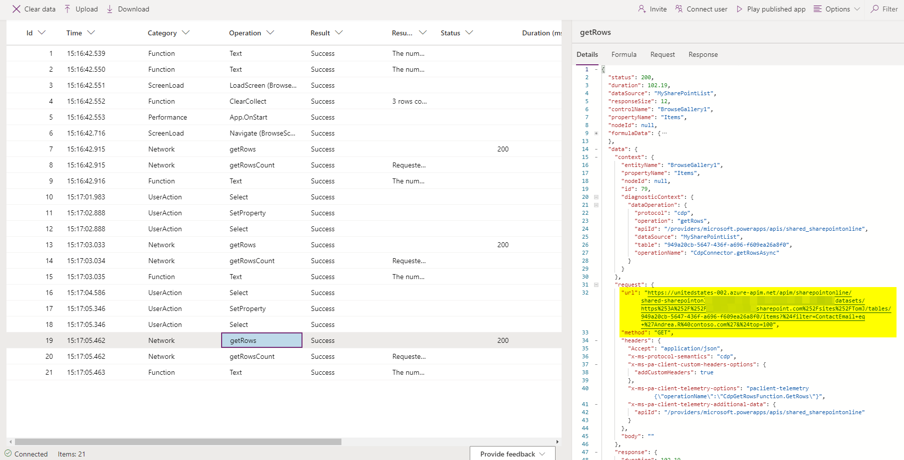 You will see that in my case these rows are coming in pairs. By clicking on a row with Operation “getRows”, I can see much more detail about the request to get this data from SharePoint.