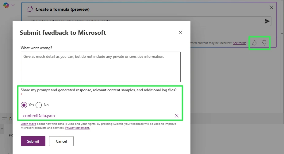 Additionally, the maker can use the thumb up/down icons to provide feedback that will help to make the product and AI interactions better over time. By sharing the prompt and response along with your feedback, it helps us understand what we can do to improve.