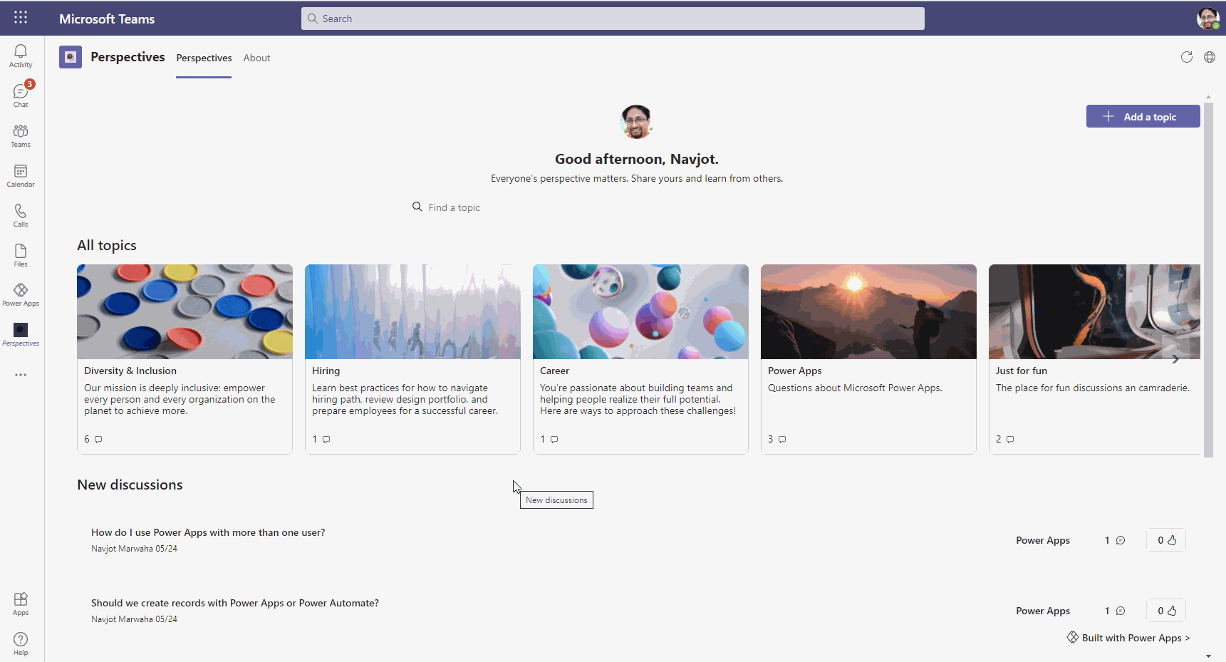 The Perspectives app is a place to listen and be heard in your organization. Start a discussion on any topic by simply posting a question or a conversation starter. Other members of the team can provide responses to the posted questions. The most relevant content rises to the top when team members upvote a response or the discussion’s creator flags one as “Recommended”. A simple search-and-browse experience makes it easy to find interesting discussions, whether you’re looking to share your perspective or tap into the collective knowledge of your team. You can easily bring ongoing Teams conversation into Perspectives.