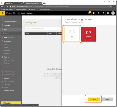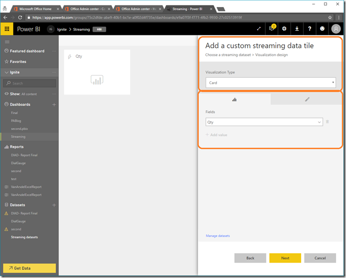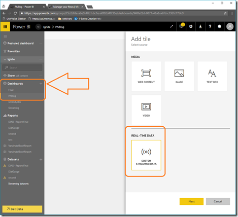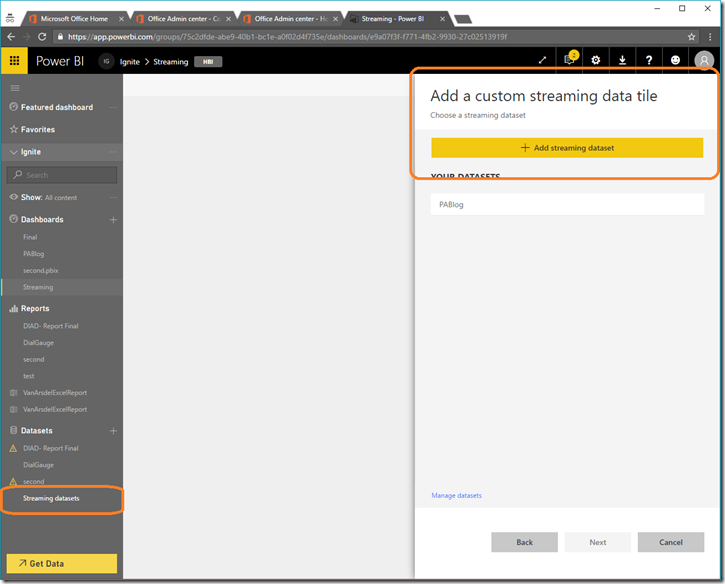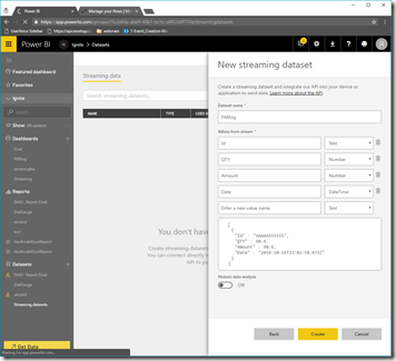 This can either be done from the streaming data set > New streaming data set or from the dashboard select “Add tile” > Custom Streaming data and select “Add streaming Dataset” (see image below).