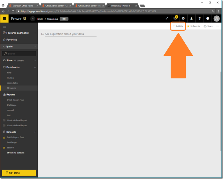 This is done by logging to Powerbi.com and pressing the “+” sign for creating a new Dashboard