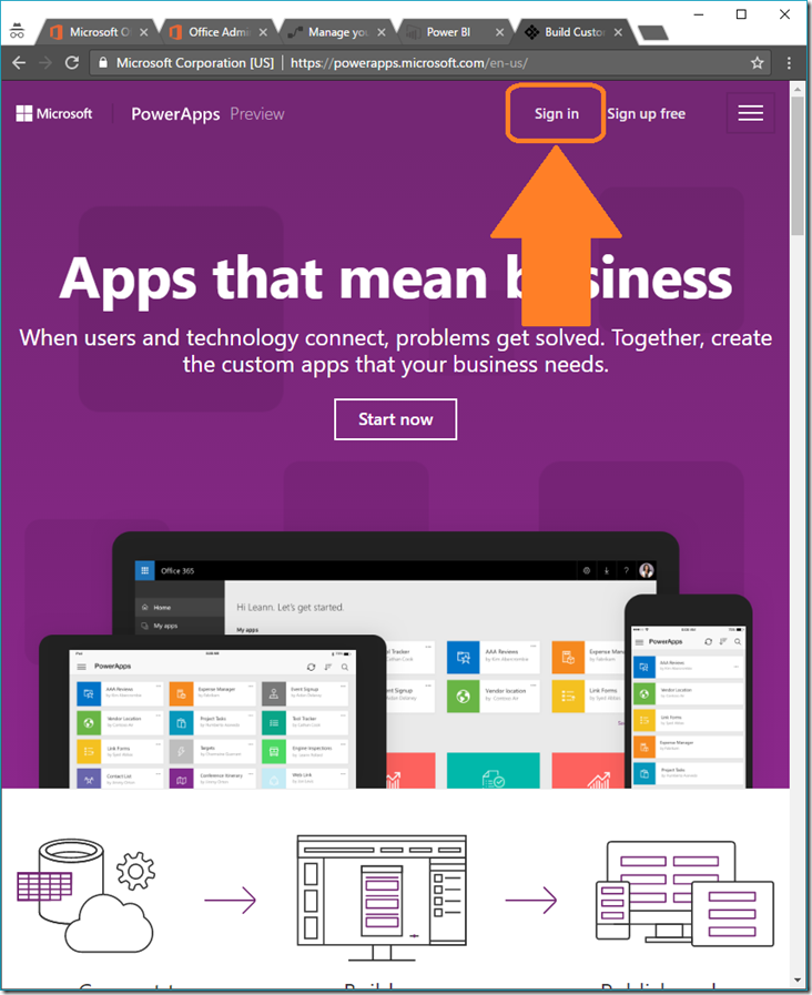 Navigate to https://powerapps.microsoft.com and select Login –with the same account you used to create the Flow above.