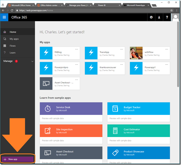 After you log into PowerApps you you can choose to get started with a sample App or start with a brand new application.