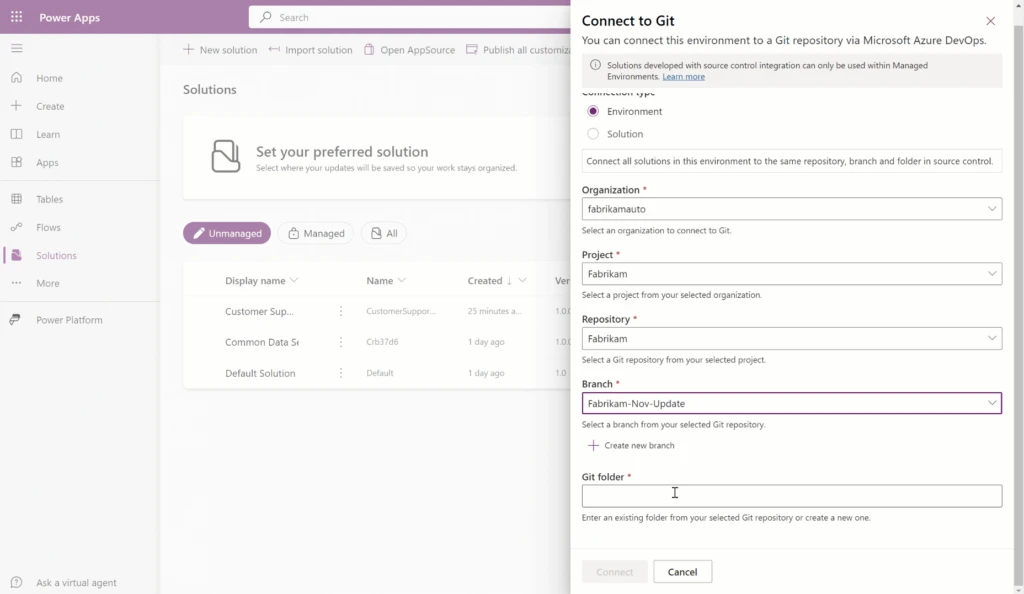 It just takes a few seconds to connect your Dataverse environment to Git. You can connect and use Git integration within Power Apps, Microsoft Copilot Studio, Power Automate, and Power Pages. You’ll also need access to an Azure DevOps Git repository.