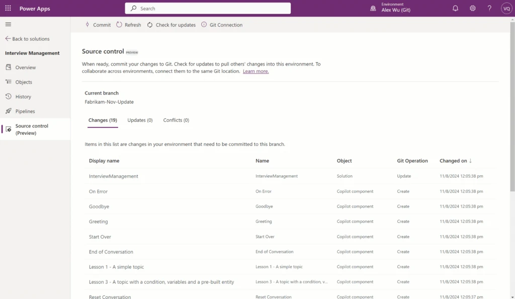 Now in public preview, Git Integration provides a streamlined experience for developers and citizen developers to build solutions together using the same development processes and best practices. Fusion teams are more productive with familiar Git functionality available directly within their environment. This native integration provides faster setup and iterations, developer and feature isolation, change tracking and auditing, version control, rollback, and more.