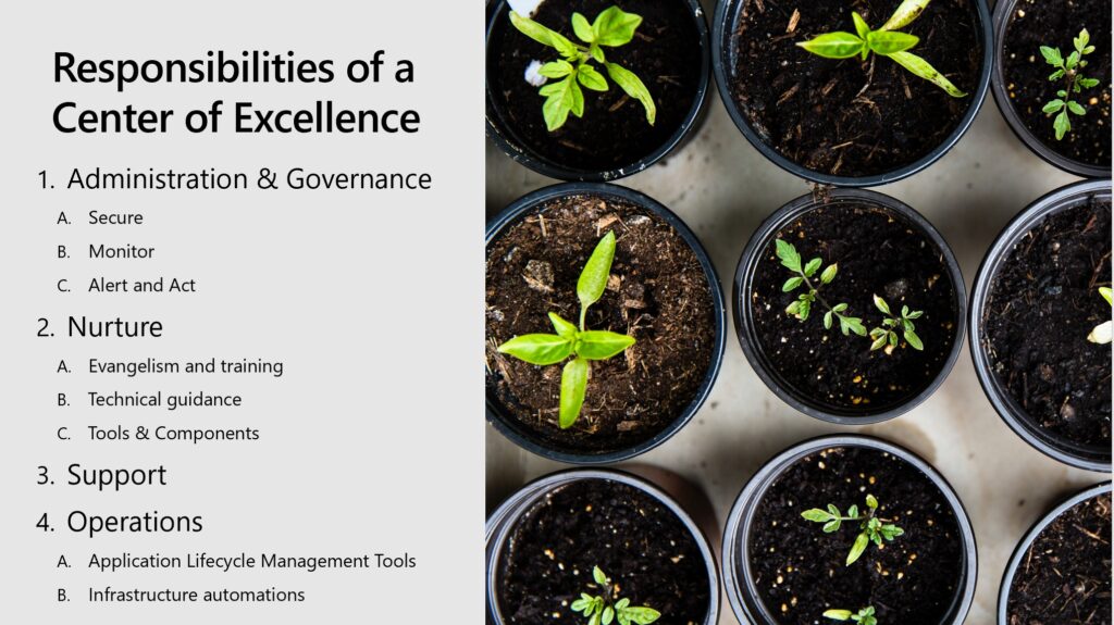 A Microsoft Power Platform Center of Excellence (CoE), as talked about in this blog post, refers to an entity that is responsible for nurturing the growth of Power Apps and Power Automate in their organization, while applying the right administrative guardrails.