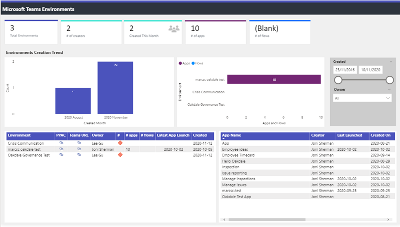 A Power BI dashboard, which is already part of the CoE Starter Kit has been updated with dedicated Dataverse for Teams views. These views give admins visibility into how their organization is using Dataverse for Teams, and can further identify highly used as well as inactive environments.