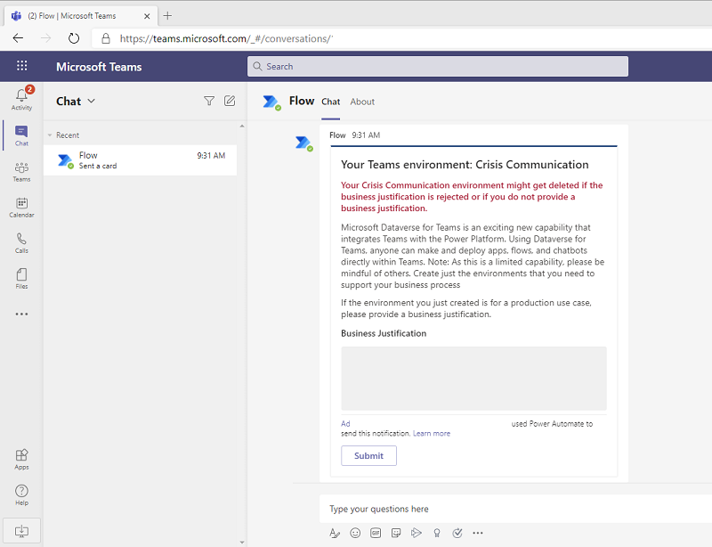 - Team owners can provide a business justification for their new environment within X days of creating the environment