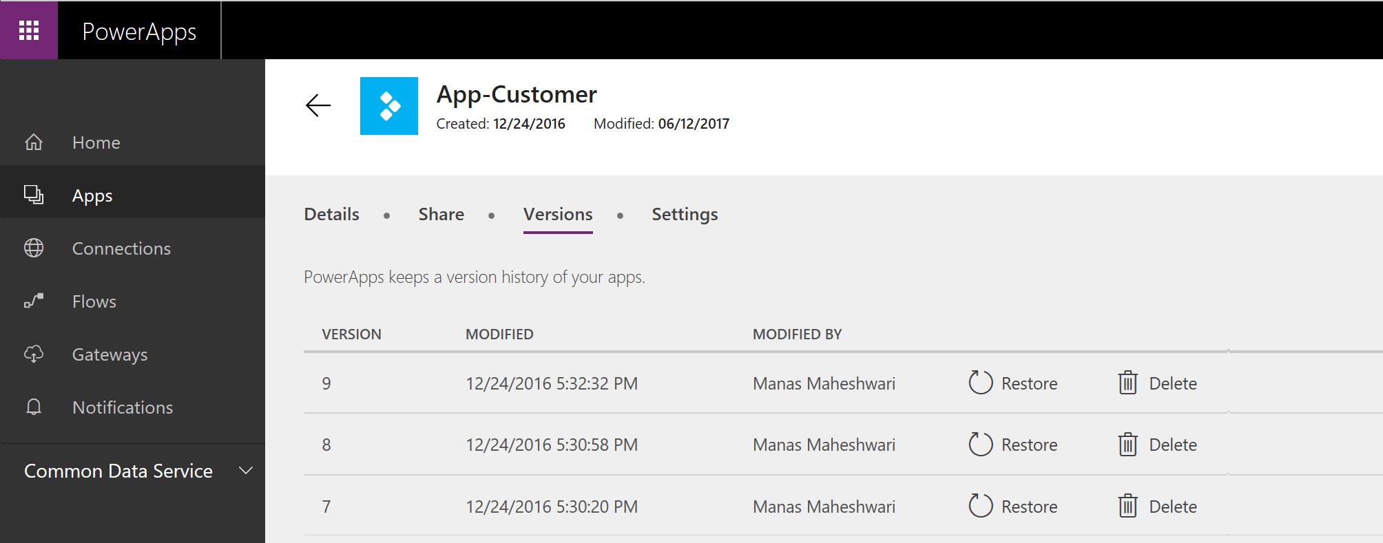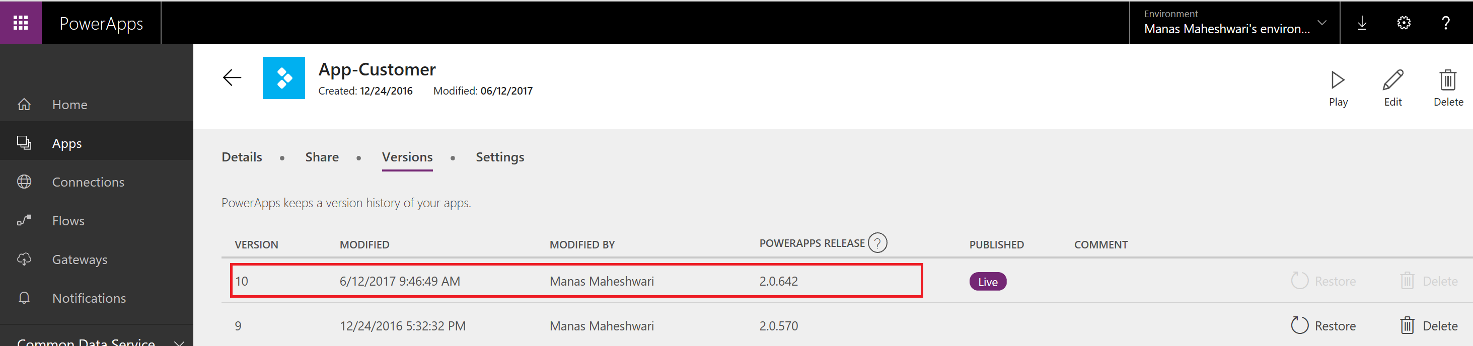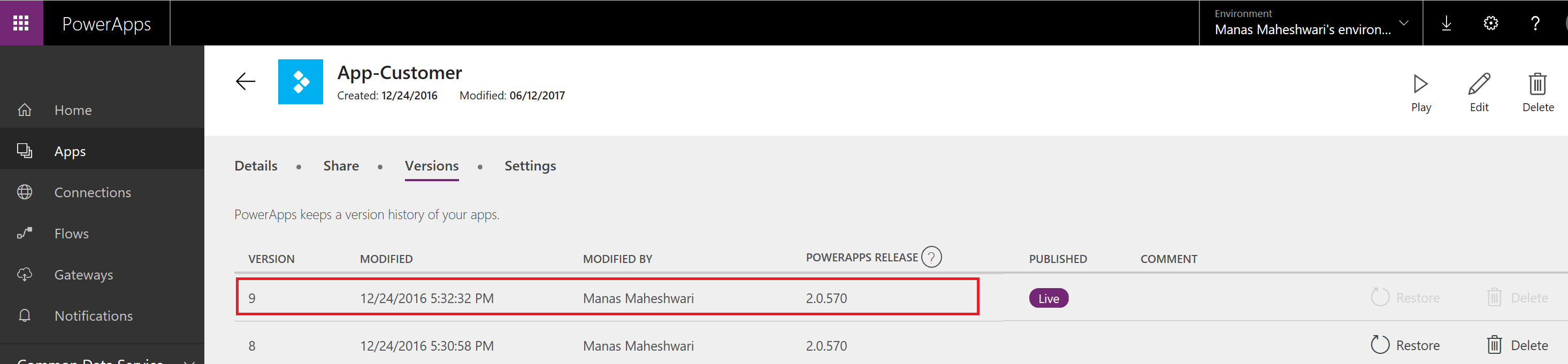 1. Say you modify and publish an app using PowerApps release 2.0.570. You’ll see that noted in the new column we created in the Versions tab called PowerApps release. This number indicates the PowerApps release with which your app was modified with.