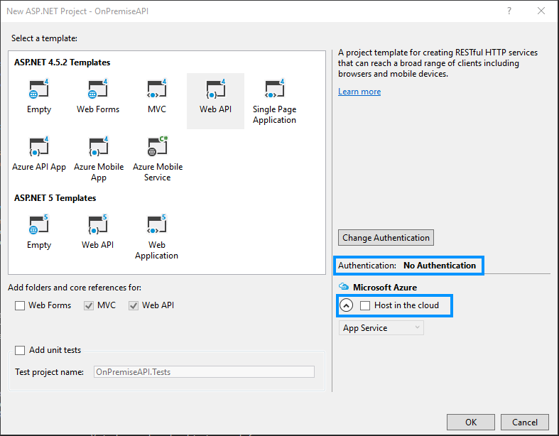 - On the next screen, select Web API and uncheck the “Host in the cloud” check box.