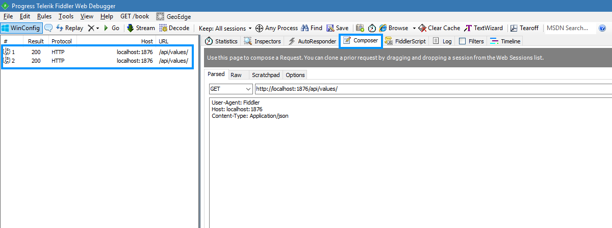 - Using the Composer functionality in Fiddler, we can now exercise our API by making a GET call to http://localhost:1876/api/values/. If the request returns with a 200 OK response, you have successfully created and hosted a RESTful web API on your local machine.