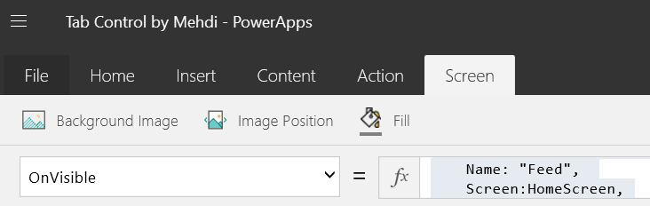 STEP 2: Now set the OnVisible property of the first screen (HomeScreen) to the following (this creates a new collection called MenuItems every time the app opens with 4 data fields):
