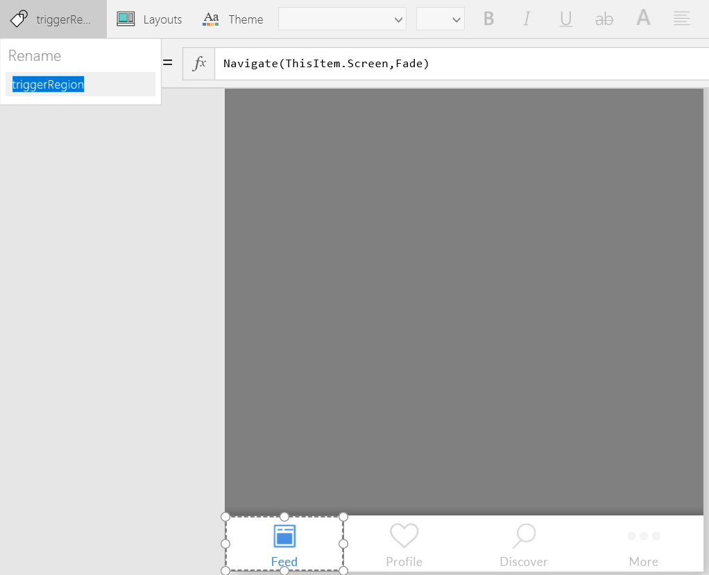 STEP 4: Now we are going to complete the configuration of the Trigger Region where our app users will tap to change screens. Reselect the template region, and insert an Image control (use your mouse to resize things as needed). Set the Image property of the Image Control to: