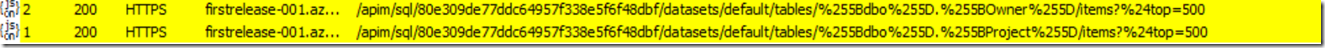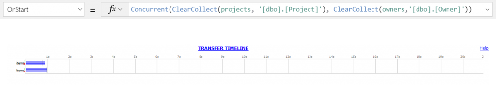 When the app is loaded,  34 calls were made through the SQL connector and took 6.582 seconds to complete (broadband connection). Taking a closer look at the timeline as seen in a fiddler network trace, we see that a call to fetch the Project table , then each visible gallery item (and few more) triggered a call to the owner database to fetch owner information for that item.