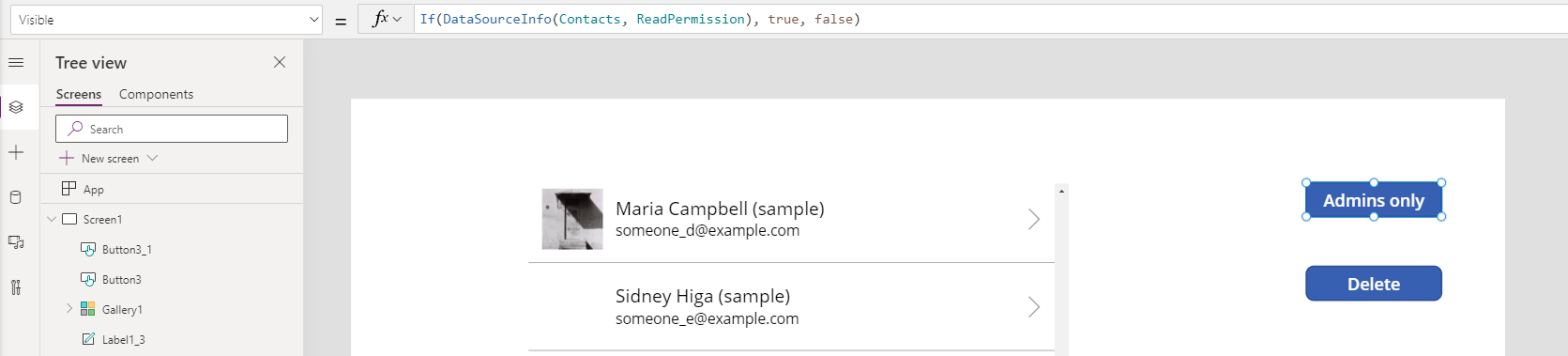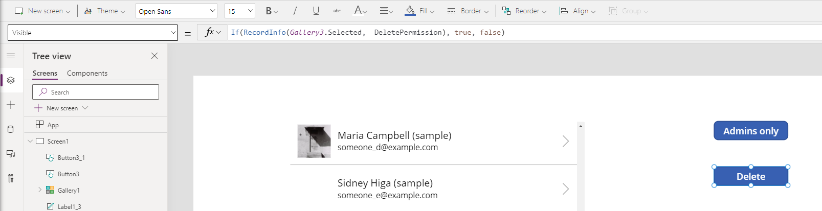The new RecordInfo function allows a Power Apps author to check for record level permissions.   Like DataSourceInfo an author can use this function to check for  read, edit, and delete permissions.  As above, an author can choose to hide or show capabilities based on these permissions.  In the example below, the ‘Delete’ button is visible when the user has permissions to delete on the currently selected record.  This example is shown with a gallery, but could also be on a form.