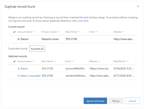 Duplicate records can happen in your data when users create or edit records manually or import data in bulk. You can easily merge data and retain the record you want and choose up to two records to merge from the view or list page.  Merge the data into a single record with the new Unified Interface merge record dialog experience.