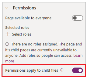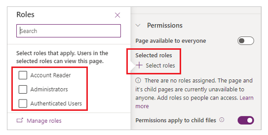 Manage page permissions right from the page properties panel with just a toggle to either allow anonymous access for everyone or restrict access to users in certain web roles only.