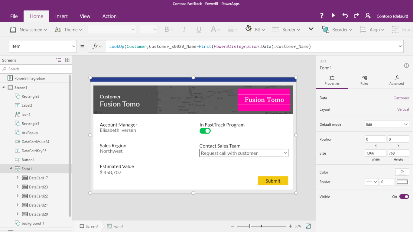 Note: The formula I used here to join Power BI data with my Customer data source is:LookUp(Customer,Customer_x0020_Name=First(PowerBIIntegration.Data).Customer_Name)