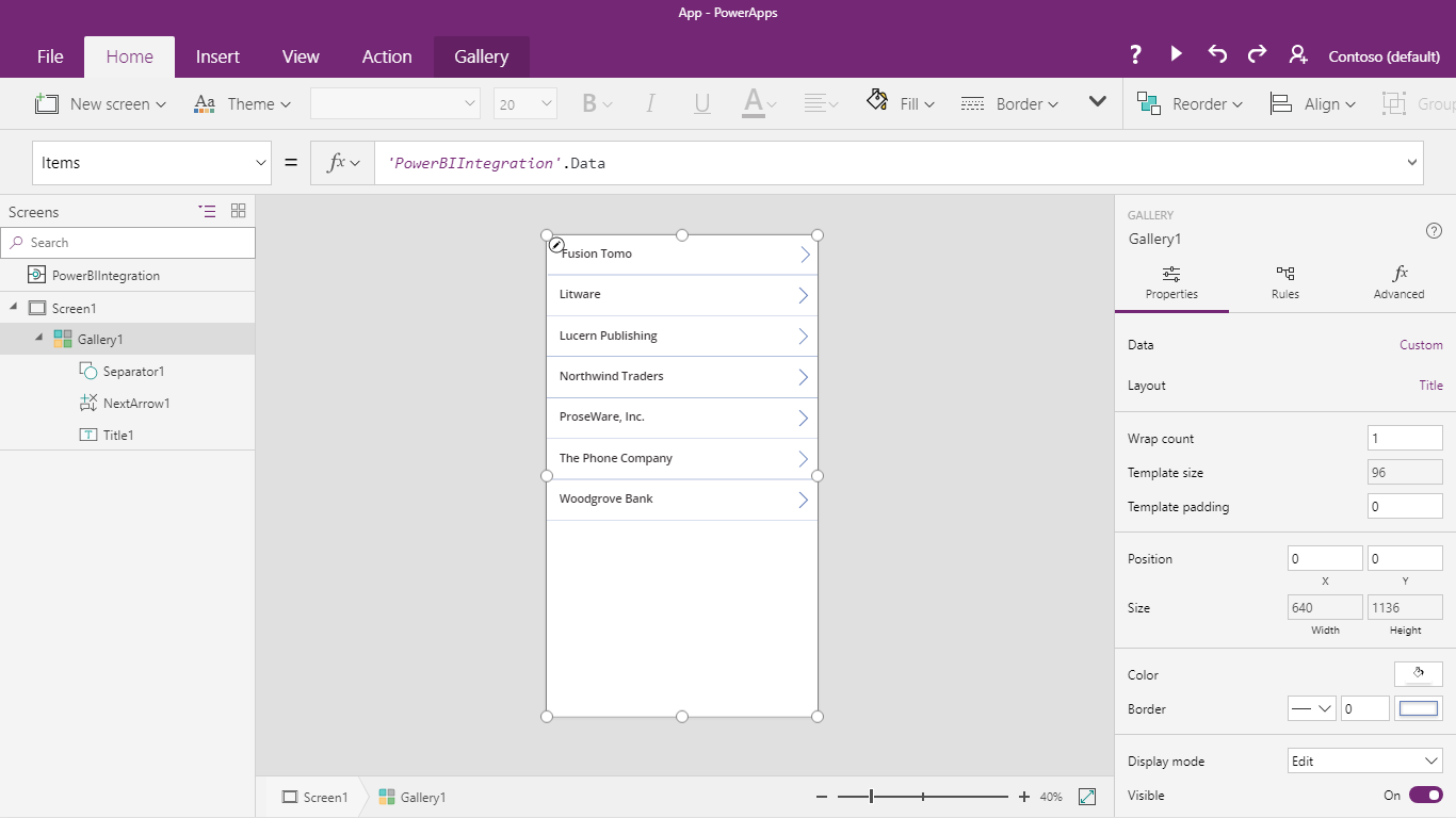 PowerBIIntegration.Dataobject in PowerApps. ThePowerBIIntegrationobject will act like any other PowerApps read-only data source or collection which can be used to populate any control, or join and filter with other data sources.