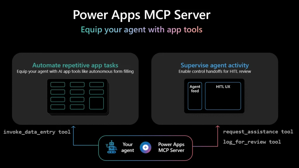 Today, we’re excited to bring the Power Apps MCP (Model Context Protocol) Server to public preview. The Power Apps MCP Server enables agents to automate repetitive app tasks, with human review and approval through the new task-centric enhanced agent feed. The Power Apps MCP Server also provides built‑in supervision tools that allow humans to review, assist, and take control of agent actions when needed.