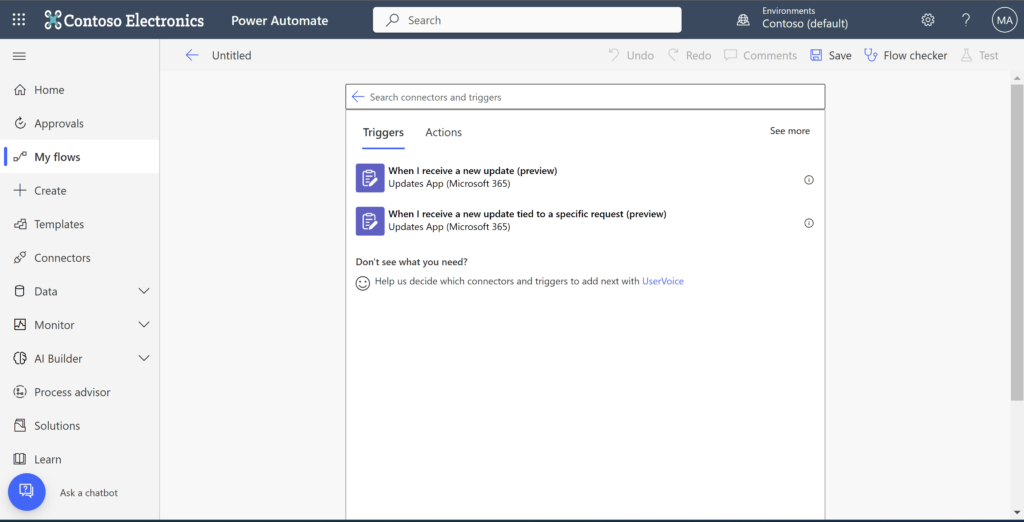 The Updates connector enables creation of Power Automate flows which trigger when an update is sent to the flow owner. For example: Use case1: Users want to trigger a flow that creates a task in Planner when they receive a new update through Updates app.-