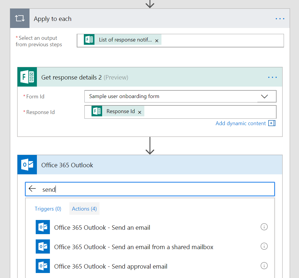 In the Dynamic Content you’ll have one option: Response Id. Select this option — this means that you’ll get the response details for the responses that caused the trigger. There can be more than one response at the same time, so the Response Id actually represents a list of responses. As a result, when you select this input you’ll get an Apply to each added around this action.