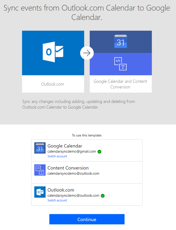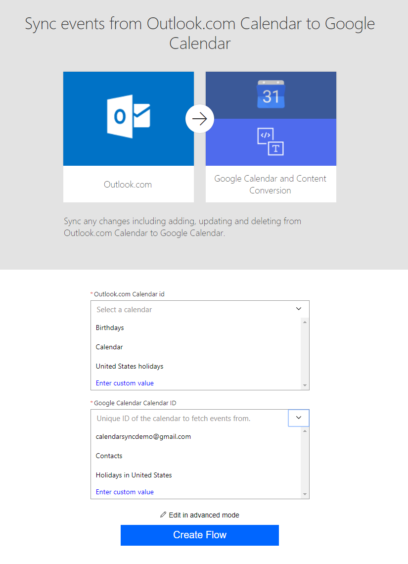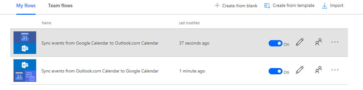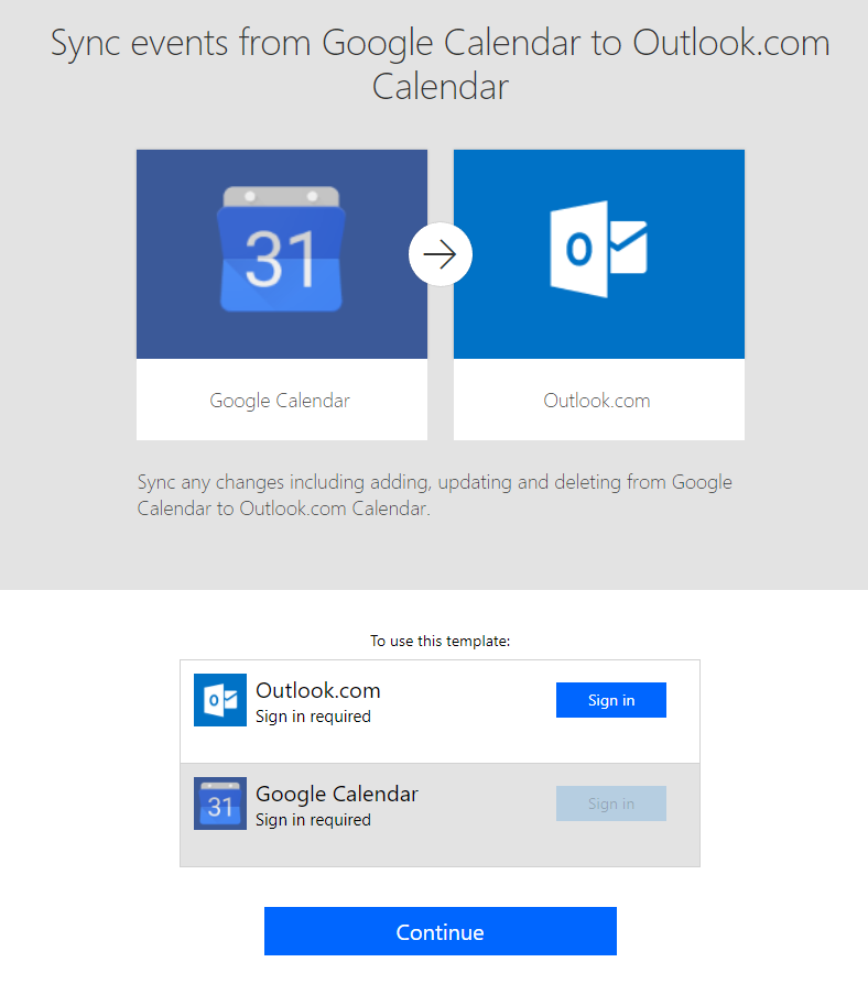 Let’s start with a simple demo of setup calendar synchronization between Google Calendar and Outlook.com Calendar by creating 2 flows from templates.