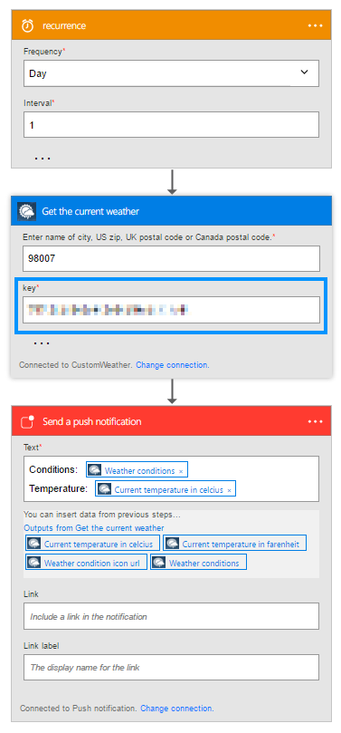 You can then setup a flow as shown to send yourself weather updates as push notifications. Be sure to paste in the API key that you acquired in the first place from apixu.