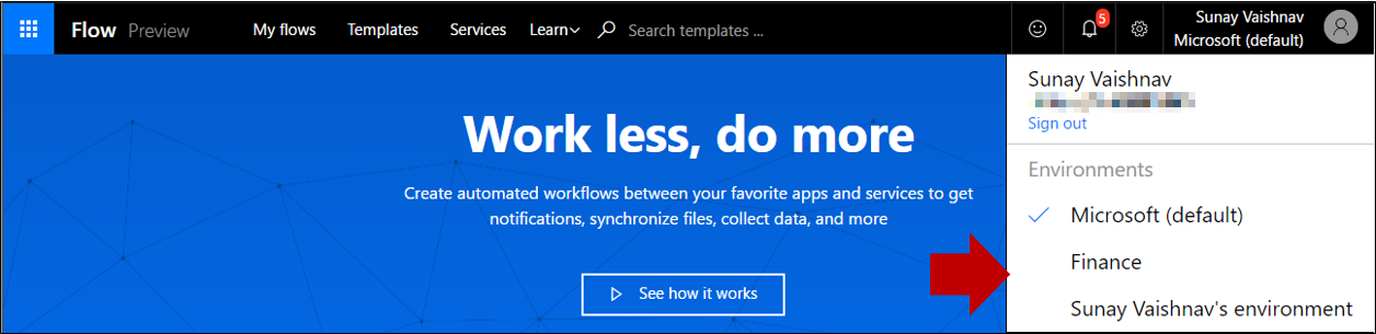 With the introduction of environments, you will now see a new experience when you come to https://flow.microsoft.com The flows, connections, and other items that are visible in the site will now be filtered based on the current environment that is selected. Your current environment is specified in the environment picker in the top bar on the right.