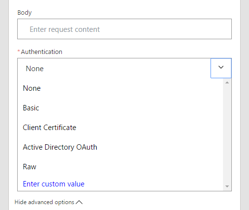 After you have selected the action, select Show advanced options and then select Authentication. The default is None, but you can choose one of four other types of authentication. After you select the endpoint’s authentication type you will be able to configure any specific data you need to send.