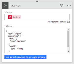 To make it easier to generate a JSON schema, we have also added a Use sample payload button. When you select this button, you can paste in your JSON content and it will attempt to generate a JSON schema that matches that payload. We have also added this new button directly on the HTTP Request card.