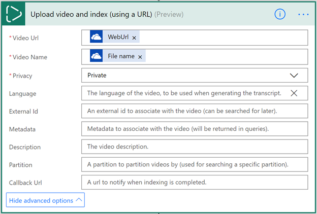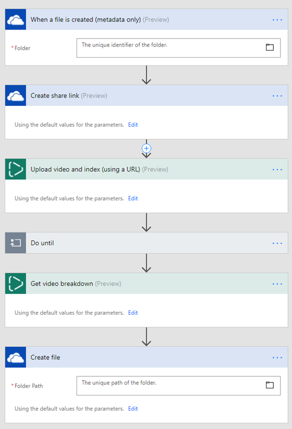 In this example, we will go with the defaults. Later we have a Do until connector that waits until the video is done indexing. Once it’s ready the Get video breakdown connector retrieve the video and the Create file saves it in the drive.