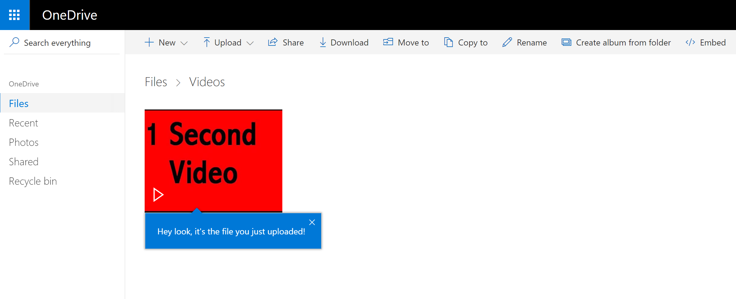 Now we can simply drag and drop files to our One Drive source folder (In my example Videos folder):