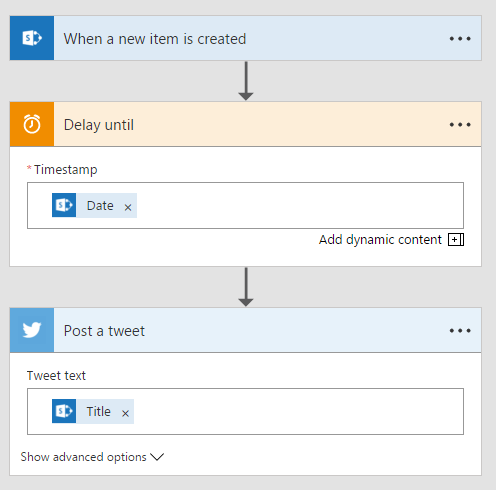 Often you want to schedule some sort of post to happen in the near future, but the service doesn’t have an auto-schedule capability. For example, you have a Twitter post that you want to make tomorrow at 8am. It’s easy to set this up with SharePoint and Microsoft Flow.