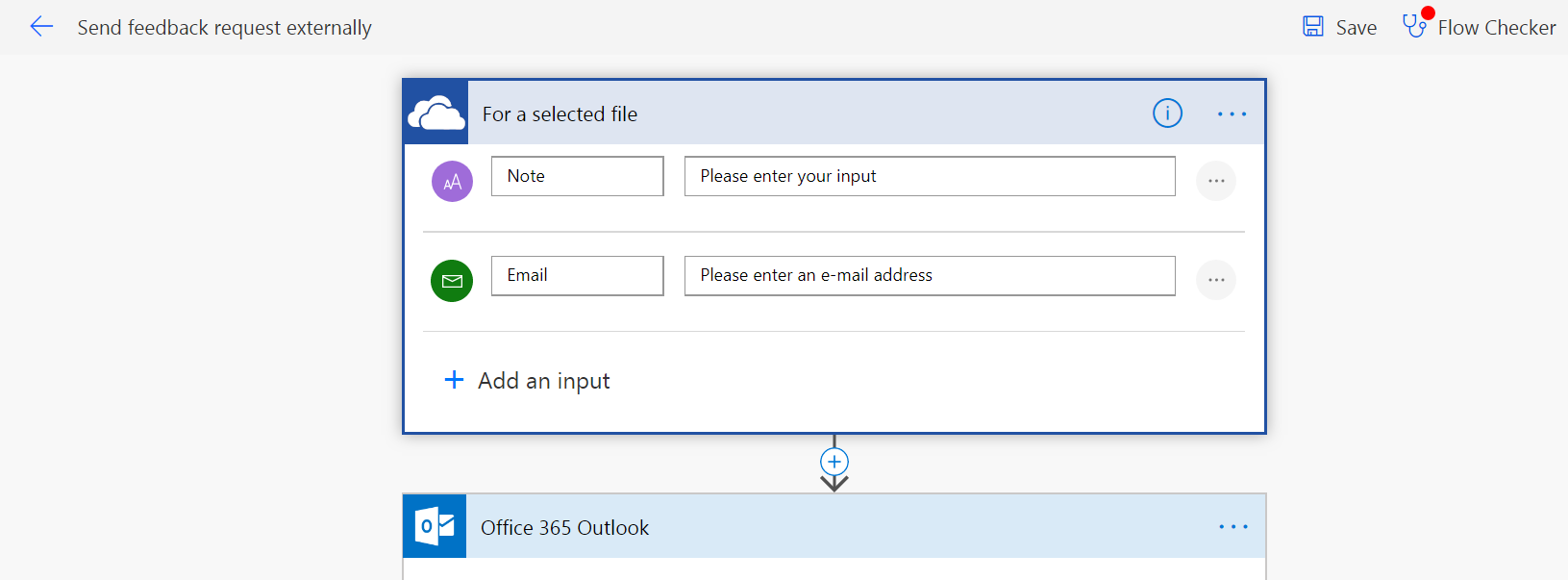 To set up a flow that collects inputs from OneDrive you can select the Flow button in OneDrive for Business and choose Create flow. This shows you a number of templates. You can also create a flow from blank inside of Microsoft Flow by choosing the For a selected file trigger under the OneDrive for Business connector: