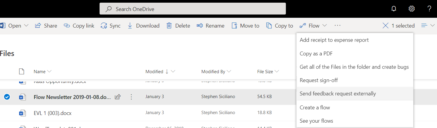 Through an embedded Flow launch panel experience, users will be able to create and run an out-of-box flow to send sign-off requests to any user in their tenant, along with a message. Once the approver responds, the initiator receives a confirmation email with feedback from the approver. In addition, for certain file types there is an out-of-box flow to Copy as a PDF. This will create a PDF file in your OneDrive alongside the file you have selected.