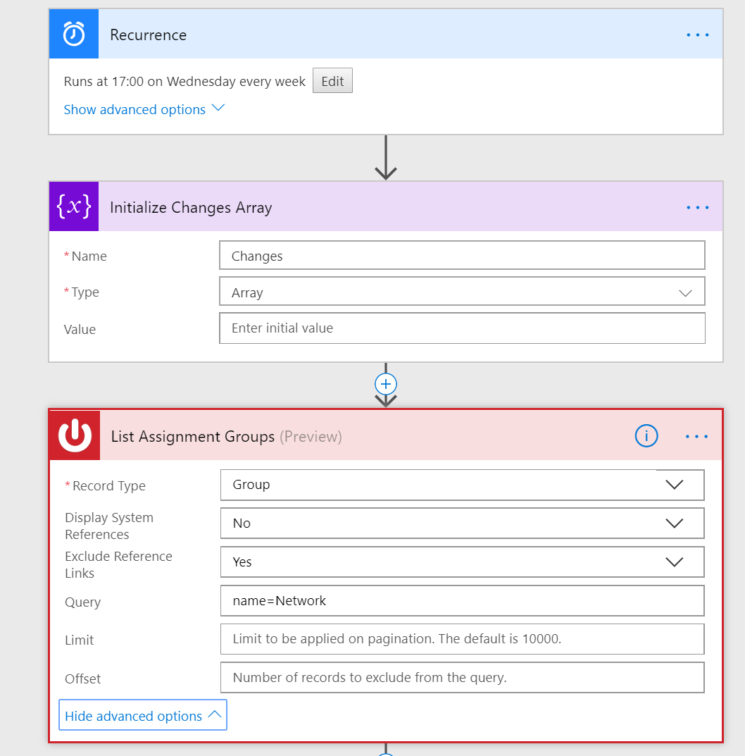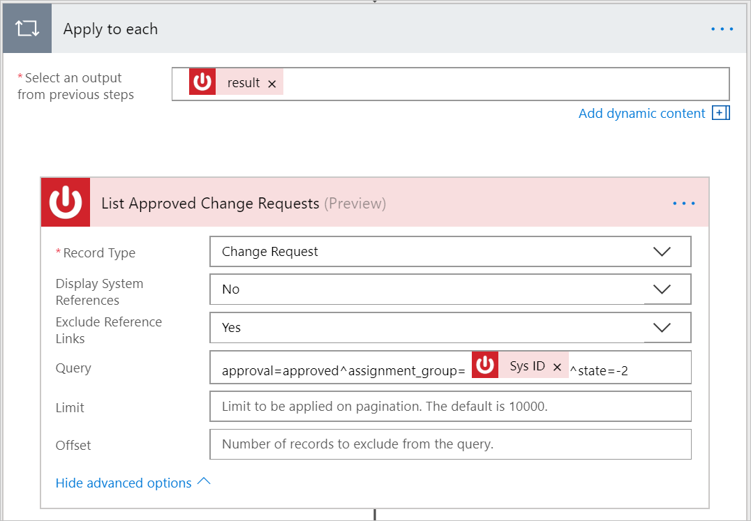 • The List Assignment Groups action will return an array. In this case we expect only 1 record as we have provided a query. As a result, when we go to use the output of our previous action, an Apply to each loop is added. Once again, we want to use the List Records action when connecting to ServiceNow. This time we are going to target the Change Request table and look for records that have been approvedassignment_group=Sys ID (returned from our List Assignment Groups call) and state= 2 which in this case means scheduled.