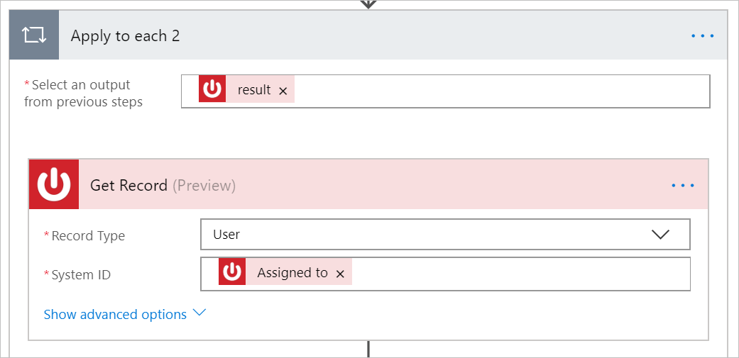 • At this point, we will have all of the approved change requests for the Network team. But, it would also be useful to have who the owner of the ticket is to ensure there is clear accountability of who is responsible for the execution of the change.  To accomplish this, we will add a Get Record action and will pass in the Assigned to value that was returned from the List Approved Change Requests action. In this particular case, the Assigned to contains a reference to the assigned to user but does not include a user friendly display name. By retrieving the User record we can retrieve their user profile.