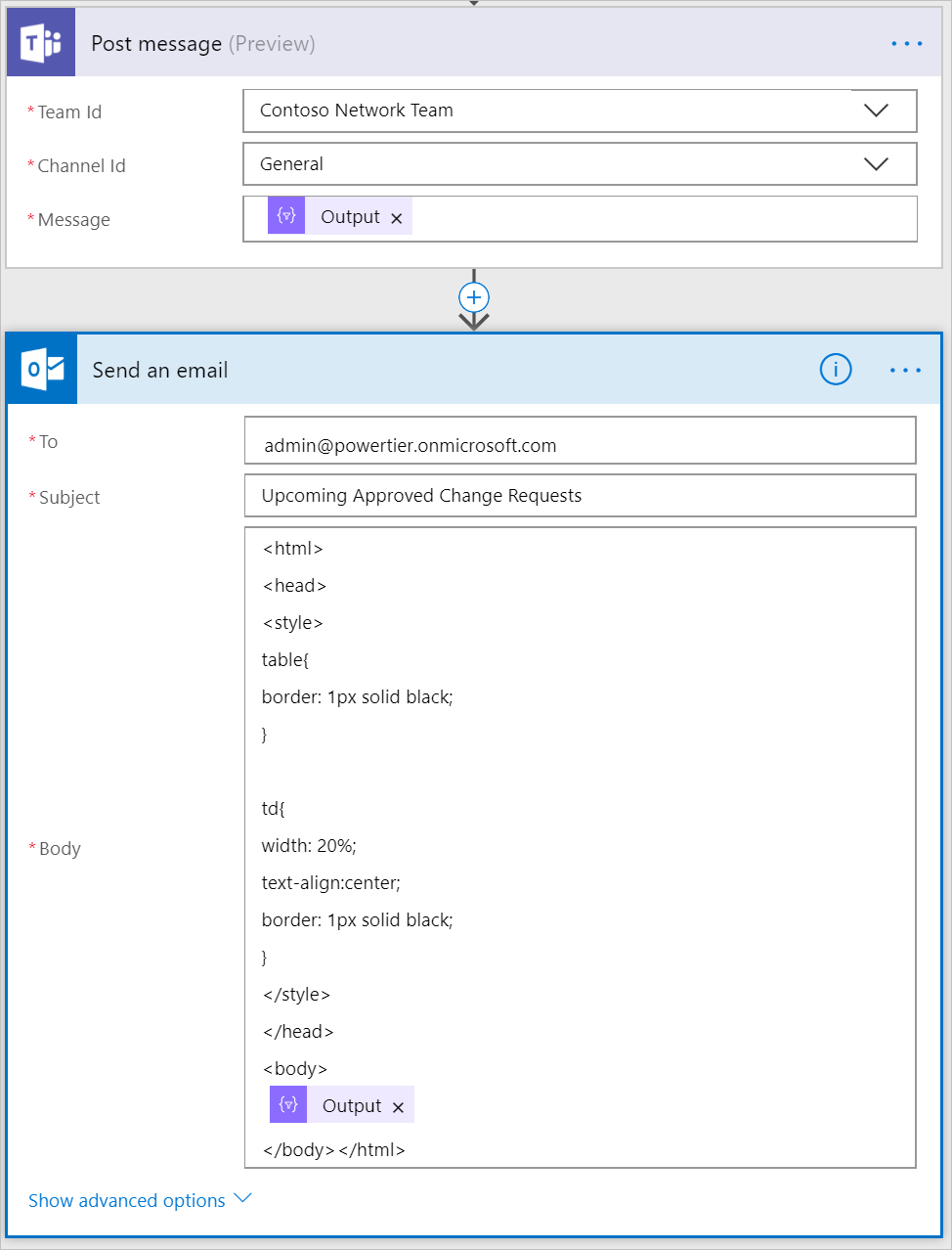 If we go ahead and run this flow, we will see the following outputs. The first one for Microsoft Teams and the second for Email which includes CSS markup.